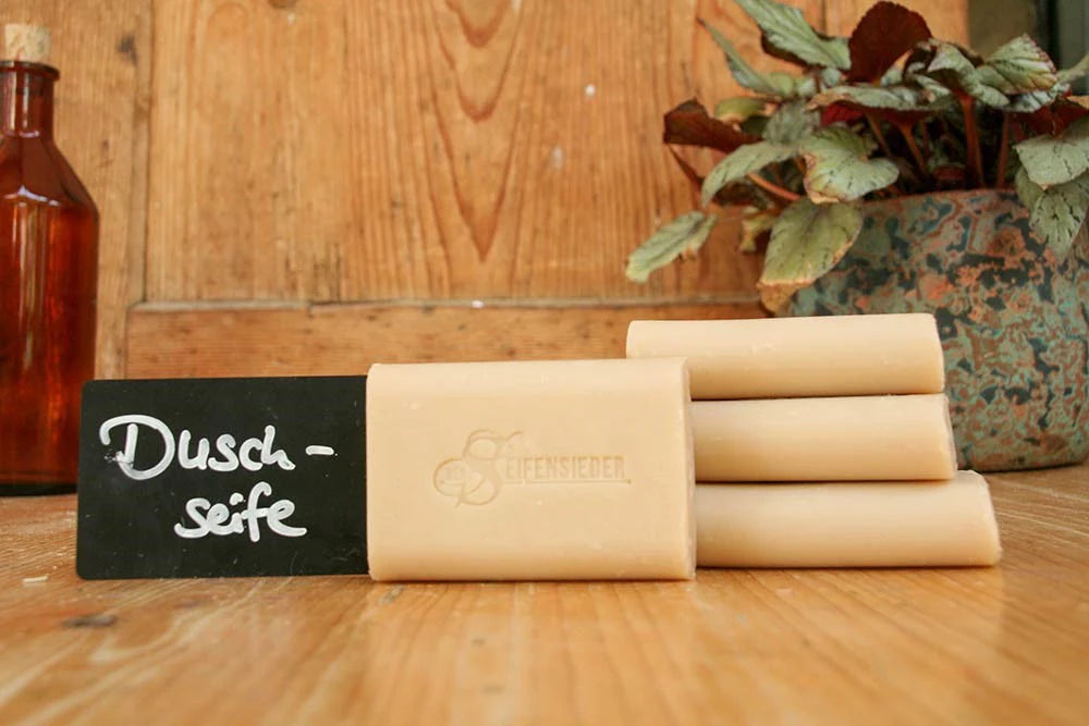 Rein pflanzliche Seife aus 70% Olivenöl und 30 % Kokosöl, rückfettend mit 20% Mandelöl