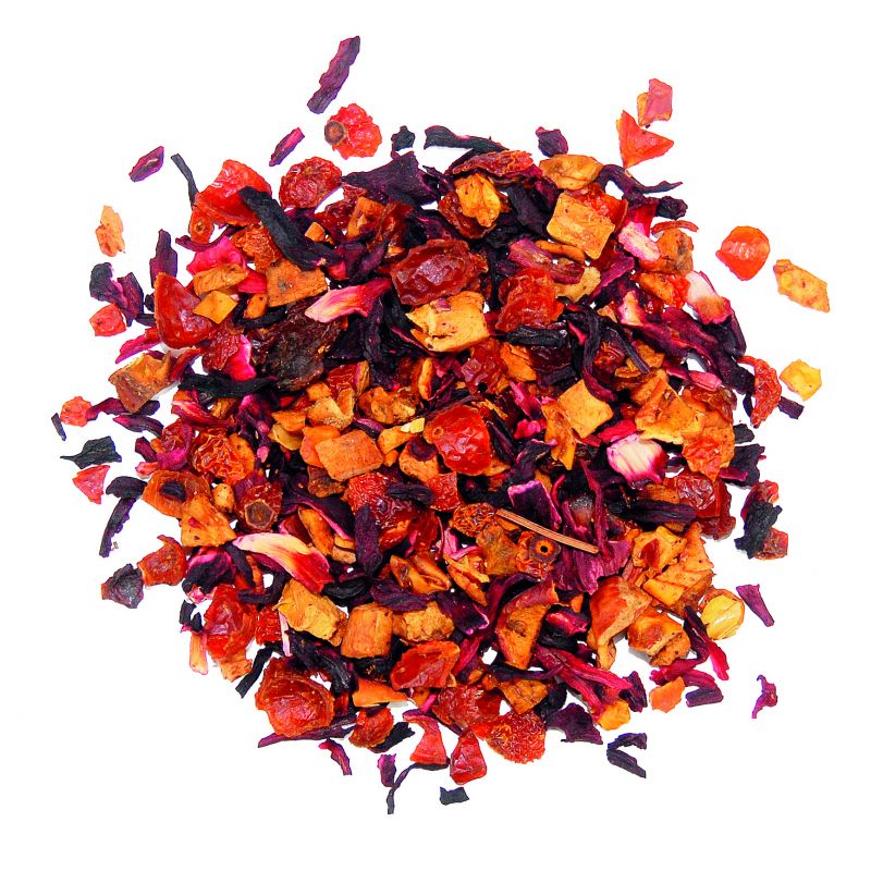 Zutaten: Apfelstückchen, Hibiskus, Hagebuttenschale, Sultaninen, Aroma