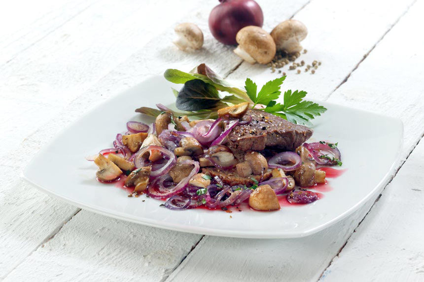 Zu b e r e i t u n g Petersilie waschen, trocken schütteln und die Blättchen fein hacken. Champignons putzen, etwas abreiben (möglichst nicht waschen) und in Scheiben schneiden. Die Zwiebeln schälen, in Ringe schneiden und in Öl glasig anbraten. Champignons dazugeben und bei starker Hitze weiterbraten bis die Champignons braun aber noch bissfest sind. Mit „Himbeer & Essig“ ablöschen und etwas einkochen lassen. Mit Salz und Pfeffer abschmecken und mit Petersilie bestreuen.