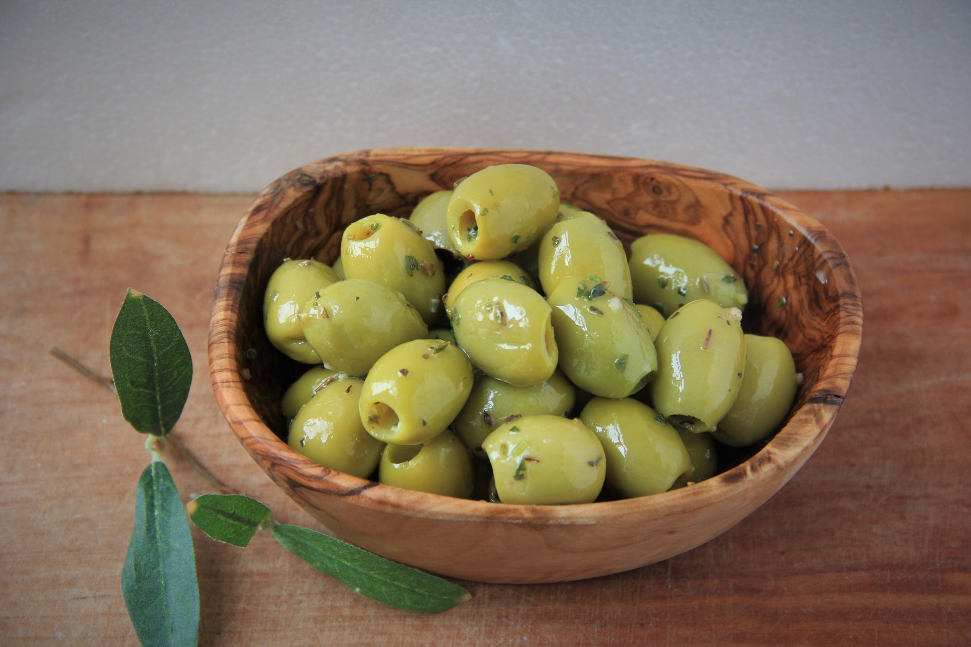 Grüne Oliven ohne Stein mit Knoblauch und Kräuter der Provence
