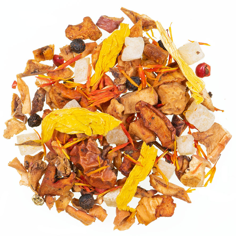 Zutaten: Apfelstücke (Apfel, Säuerungsmittel: Zitronensäure), kandierte Mangostücke (Mango, Zucker)(15%), natürliches Aroma, Süßkraut, rosa Pfeffer(3%), schwarzer Pfeffer(2%), Saflorblüten, Sonnenblumenblüten