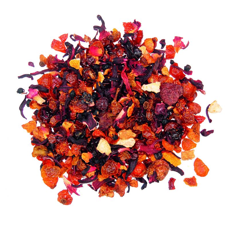 Hagebuttenschale, Hibiskus, Holunderbeeren, Apfelstückchen, natürliches Aroma, Himbeerstückchen (3 %), Orangenschale, Rosenblüten