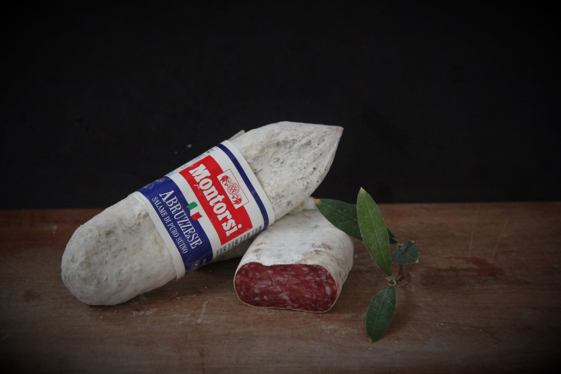 Diese typische Salami aus den Abruzzen (Region in Mittel-Süd-Italien) wird aus besonders feinkörnigem Fleisch hergestellt, das fachmännisch gewürzt und in kleinen Metallkäfigen luftgetrocknet wird, was ihr die typische flache Form verleiht. Sie hat einen feinen Geschmack mit einem Hauch von Pfeffer.