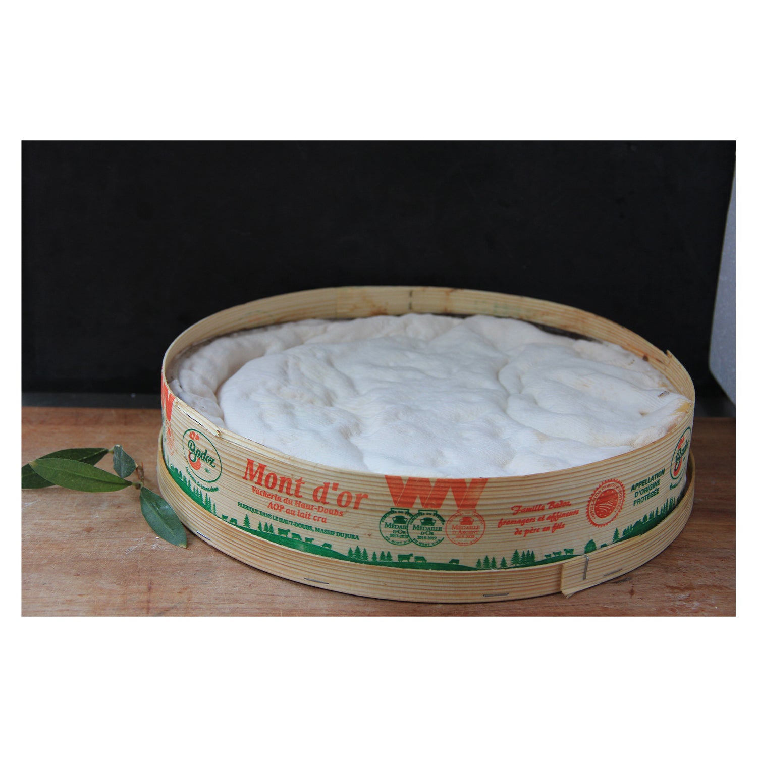 Der französische Mont-d‘Or wird mit Rohmilch hergestellt. Der gelblich-weiße Teig ist cremig weich. Er reift, umspannt von einem Band aus Fichtenholz, der seinem Geschmack mit zunehmender Reifung eine waldige Note verleiht.